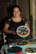 Thousands of kilometers into the jungle lives the small Wayana tribe quite isolated from most other Surinamese. A hand full of their artists make colorful maluana, a round wooden slice painted with mythological figures in four bright contrasting colors referring to the history of the Wayana people. Around them there are circles decorated with small triangles on the edges. For ages the maluana was suspended from the ceiling in the middle of the community hut and was made from the trunk of the majestic kankantrie *(wild cotton tree) .Now maluana in all sizes are painted on carefully managed cedar wood for tourists. The diverse mythological beings on the maluana symbolize the most important spiritual powers, which the Wayana met on their migration of the Amazon namely tokokosi and kuluwayak, very dangerous worms with two heads and mulukot, the mythical fish. Favorites are also the ant eater, the turtle, and birds or frogs. The selling of the maluana as handicraft is one of the few ways for the Wayana to break through their isolation and is an underlining of their unique cultural identity. See also article on maluanas in ‘interesting articles’.
